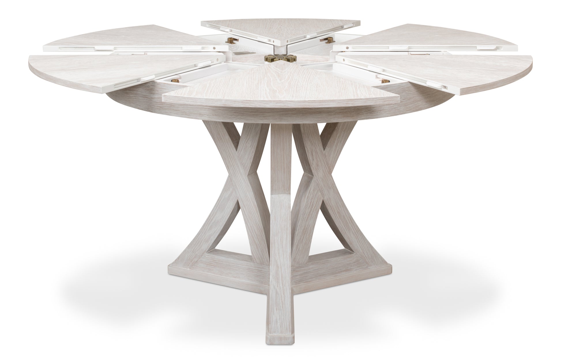 - Expandable Design: The Casual Jupe Dining Table effortlessly transforms from a cozy 45-inch diameter table to a spacious 56-inch table when open. This simple mechanism allows you to easily adjust the table's size to accommodate intimate dinners for four or larger gatherings of up to six comfortably.