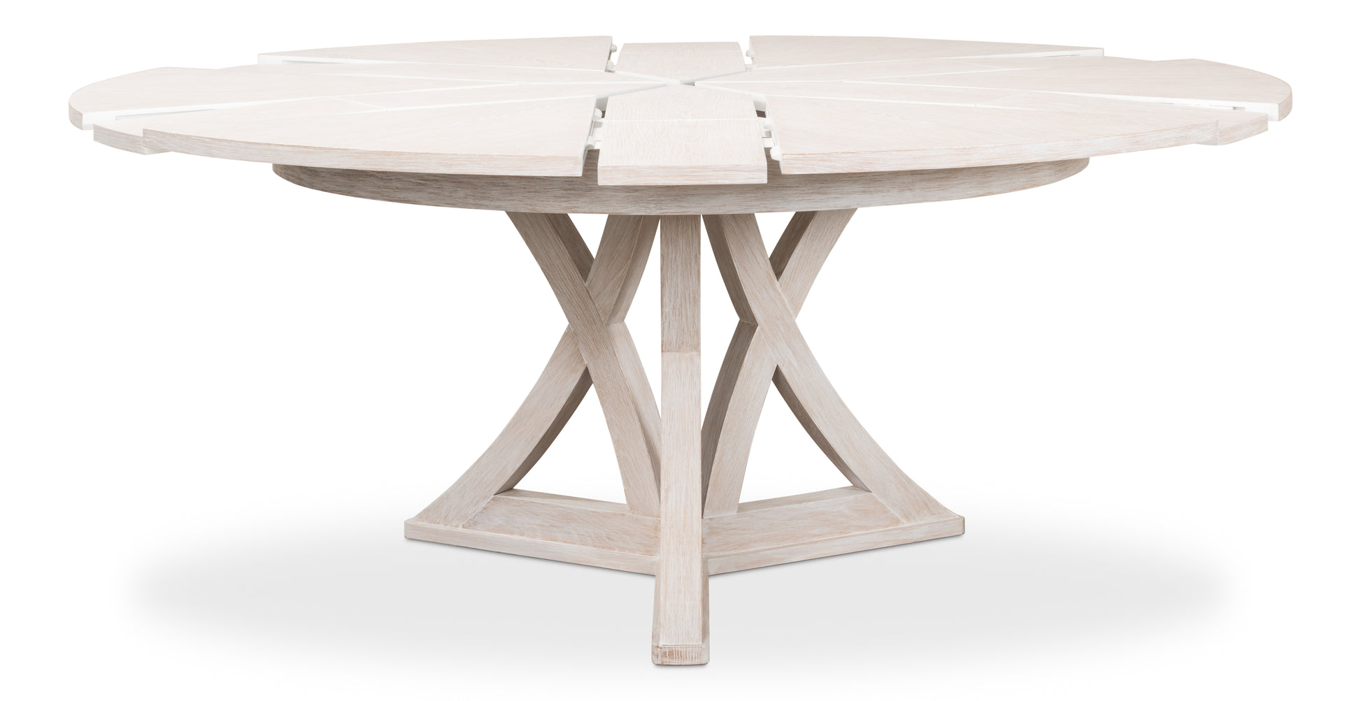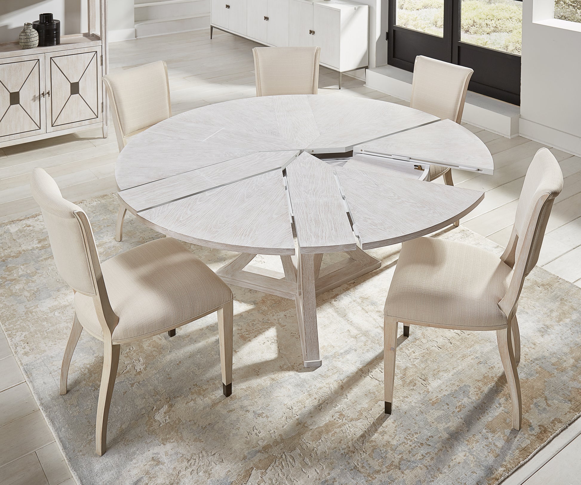 - Expandable Design with Self-Storing Butterfly Leaf: The Casual Jupe Dining Table effortlessly transforms from a cozy 54-inch diameter table to a spacious 70-inch table when open. This convenient self-storing butterfly leaf eliminates the need for extra storage space and allows you to easily adjust the table's size to accommodate intimate dinners for four or larger gatherings of up to eight comfortably.