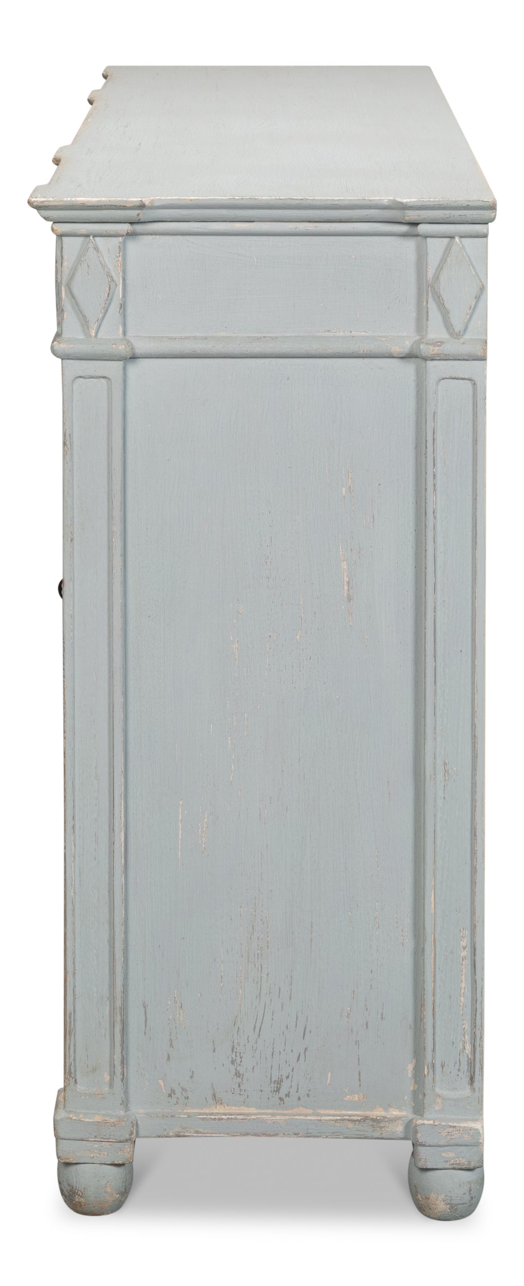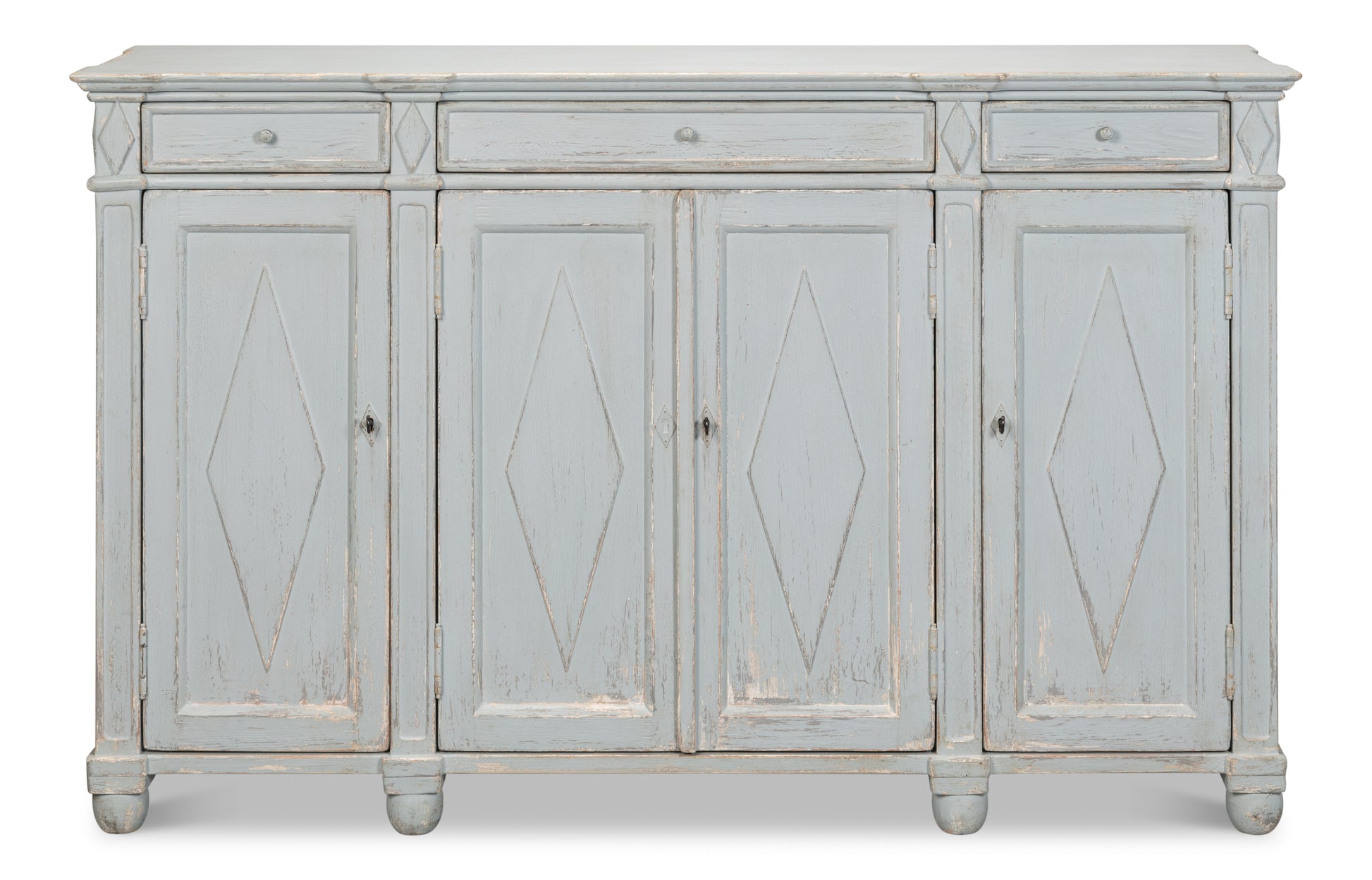 Elevate your home decor with the exquisite Diamond Wall Sideboard by Sarreid. This stunning sideboard, finished in a beautiful whitewash, exudes coastal charm and sophistication, making it a perfect addition to any modern or traditional setting. Crafted from reclaimed pine, this sideboard boasts a unique character and enduring quality. Its spacious design features three removable shelves, providing ample storage for your tableware, linens, or decorative items. Three drawers, gliding smoothly on quality runners, offer additional concealed storage space for keeping your essentials organized. The Diamond Wall Sideboard seamlessly blends practicality with elegance. Its crisp whitewash finish complements the natural beauty of the reclaimed pine, while the clean lines and subtle detailing add a touch of sophistication. This versatile sideboard can be placed in your dining room, living room, or entryway, adding a touch of coastal elegance to any space.